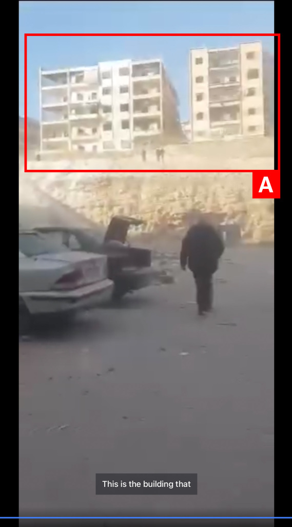 Reports of the incident mention a residential building being struck in the Al-Izaa neighbourhood (حي الاذاعة) in Aleppo (حلب). Analysing audio-visual material from sources, we have narrowed the location down to the following exact coordinates: 36.191870, 37.131851.