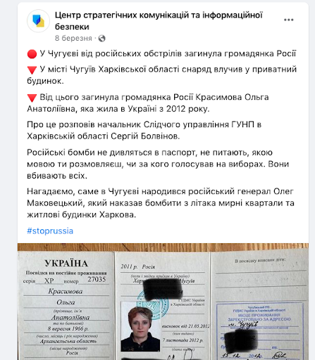 A tweet from @SerhiiZhorzh reported that a female Russian citizen was killed when Russian shelling hit her home in the city of Chuhuyiv, and that she had been living in Ukraine since 2012. Status Quo News attributed the announcement of the death of the Russian citizen to the head of the Investigation Department of the Main Directorate of the National Police of the Kharkiv region Sergey Bolvinov.