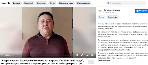 Slovoidilo News reported that according to Kharkiv Ecopark’s Facebook page, two civilians who came to feed the animals were killed when Russian soldiers attacked them with mortar and automatic fire. The people that were killed had been coming to the park once every three days to feed the animals.