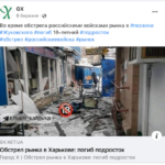 Suspilne Media reported that a 16 year old boy was killed by shelling of the market located at 5/7 Akademika Proskury Street in the village of Zhukovsky. Market Director Maryna Volobuyeva stated that she was informed about the shelling around noon and that the market did not suffer significant damage because the shell hit the pavilions near the market.