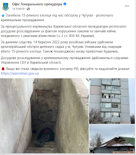 The Office of the General Prosecutor reported via Facebook that, under the procedural supervision of the Kharkiv Regional Prosecutor’s Office, the investigators of the SBU Special Forces initiated an ongoing pre-trial investigation into the violation of the laws and customs of war, combined with premeditated murder (Part 2 Article 438 of the Criminal Code of Ukraine).