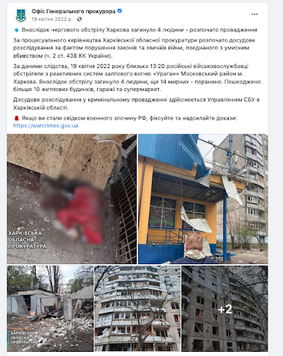 Most of the assessments of the strike are based on a report by the Kharkiv Regional Prosecutor’s Office, which states that a Russian urugan (“Hurricane”) missile strike on the Moscow District at 1:20 PM killed four civilians and injured 14. Also commonly cited is the prosecutor’s statement that the strikes damaged more than 10 residential buildings, garages, and a supermarket.