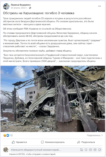 Local community chairman to Dergachiv, Vyacheslav Zadorenko, described the day’s events as “In the city of Dergachi and almost all settlements, they [Russian military] beat artillery, hailstones and mortars. Almost all over the community there are destroyed houses, they are burning now”. Widely reported by sources such as Hromadske news, TSN.ua, and Rayon the Russian forces had additionally hit gas pipes, leaving homes and businesses within 2500 yards of the impact without gas.