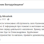 Ukrainska Pravda said: “In Kalynove, two people were killed when a projectile hit a house. The shelling of the village took place from the side of Kozachya Lopana at approximately 4:00 p.m. [according to] Kovalenko’s [head of Zolochiv community] direct speech: “Two men, 71 and 51 years old, went to a house to have lunch. And then a projectile flew right into the house. Both died.” Kharkiv Human Rights Protection group reported that “a shell hit the house where two men were staying. The direct hit started a fire that destroyed the entire building and left the men with life-threatening injuries”.