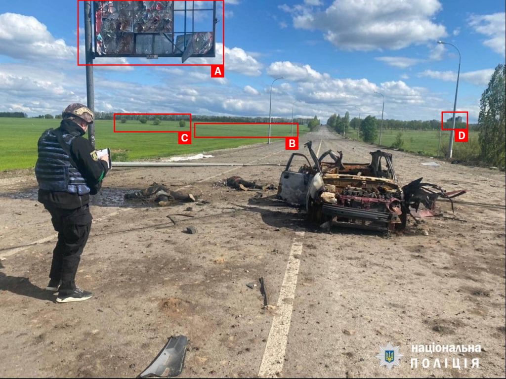 Reports of the incident mention the road between Kharkiv (Харків) and Tsyrkuny (Циркуни). Analysing audio-visual material from sources, we have narrowed the location down to the following exact coordinates: 50.054116, 36.361157.