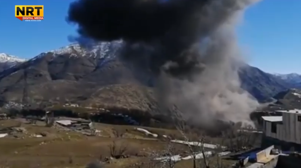 @EnglishZhyan posted a video of the strikes with the caption: “Video shows moment a Turkish airstrike hits areas nearby civilian houses in the Kurdish village of Shene in Qaladze’s Pshdar area, causing damage to the houses.”