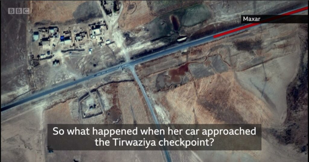 BBC news Arabic conducted an investigation into the incident that was published as a video by BBC News on January 13th, 2020. The investigation found out that a convoy that belongs to Ahrar Al Sharqiya, a faction of the Syrian National Army supported by Turkey, crossed from Turkey to Syria on the morning of that day. They took over a checkpoint on the motorway between Hasakah and Manbej. A video of them at the checkpoint show them arresting people and executing one person. Through satellite images, the investigators were able to identify the features of the area and locate the videos to be on the M4 Highway, which Hevrin Khalaf was passing through to get to a meeting from Hassaka to Raqqa, her party’s headquarters.The checkpoint that Ahrar Al Sharqiya took over was identified as Tirwaziya checkpoint.