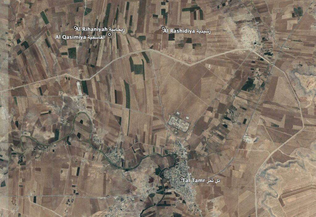 Reports on the incident mention multiple areas being struck in the vicinity of Tal Tamr (تل تمر). Among these are Al Rashidiya (رشيدية) at: 36.7077883, 40.3632975, Al Qasimiya (القاسمية) at: 36.7056896, 40.3403807 and Al Rihaniyah (ريحانية) at: 36.708056, 40.325833. Due to limited satellite imagery and information available to Airwars, we were unable to verify the location further. The generic coordinates for Tal Tamr are: 36.696047, 40.368058.