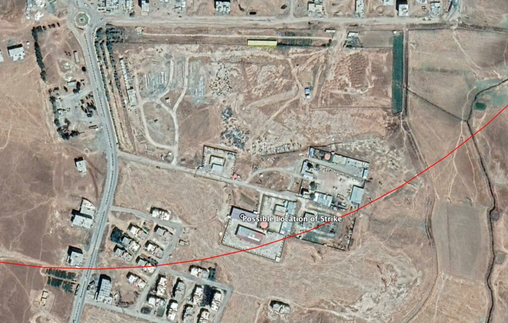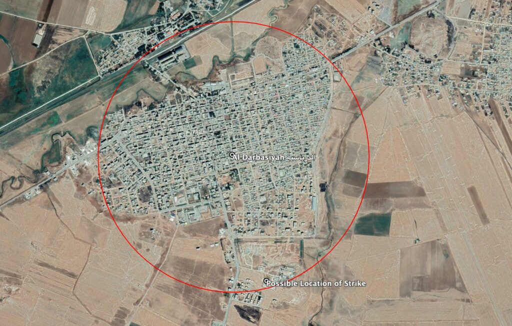 Reports of the incident mention a Russia military checkpoint or area approximately 1km outside from Al Darbasiyah (الدرباسية). Due to limited satellite imagery and information available to Airwars, we were unable to verify the location further. A possible location for this strike, that matches the type of building within the audio-visual material, is at these coordinates: 37.063375, 40.655364.