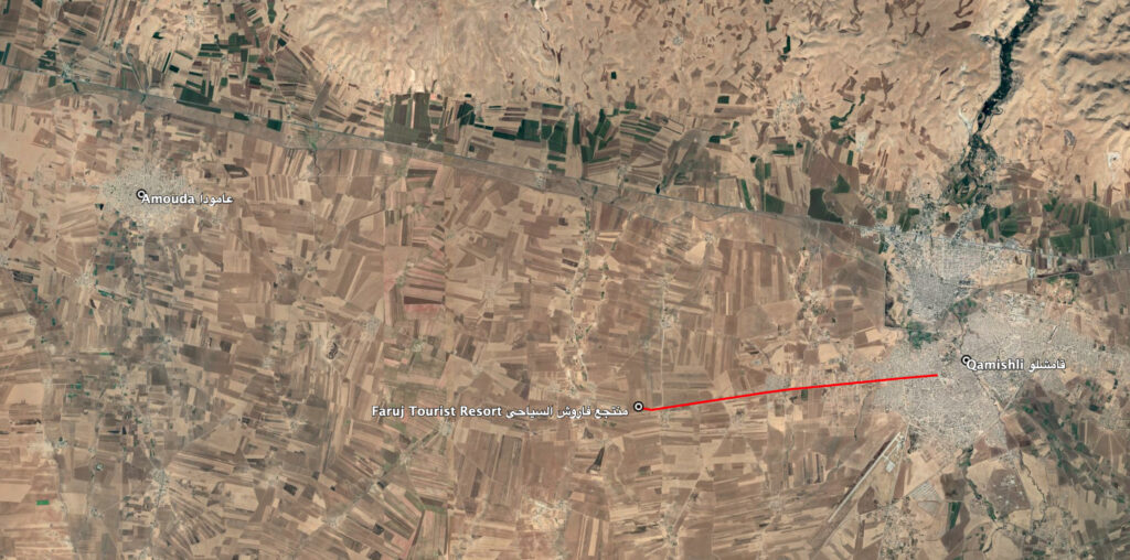 Reports of the incident mention a vehicle being struck east of the Faruj Tourist Resort (منتجع فاروش السياحي) on the road between Amouda (عامودا) and Qamishli (قامشلو).
