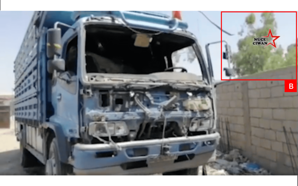 A local source told North Press that “at about 10 a.m, a ‘Turkish’ drone attacked a location near a local market in Maysaloon neighborhood in the city of Qamishli,” resulting in an injury to one civilian and material damage to three food transport trucks. Syrian Observatory for Human Rights identified the market struck as Al-Hal market while Hawar News detailed the location to be near martyr Dalil Sarukhan shrine.
