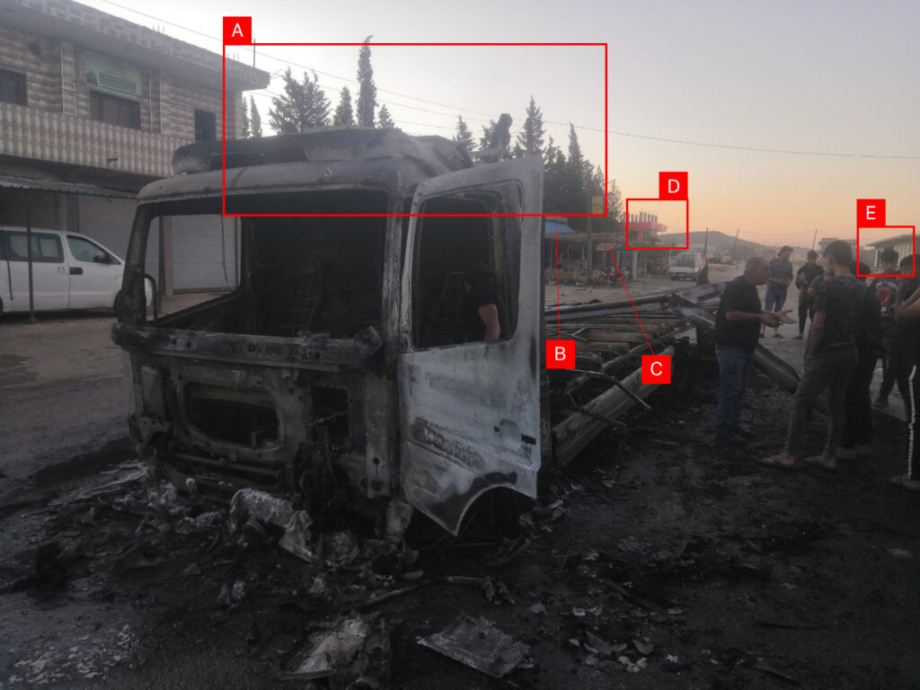 Reports of the incident mention the village of Khan Al Jabal (خان الجبل). Analysing audio-visual material from sources we have narrowed down the location to these exact coordinates: 37.083185, 42.081874.
