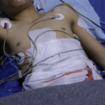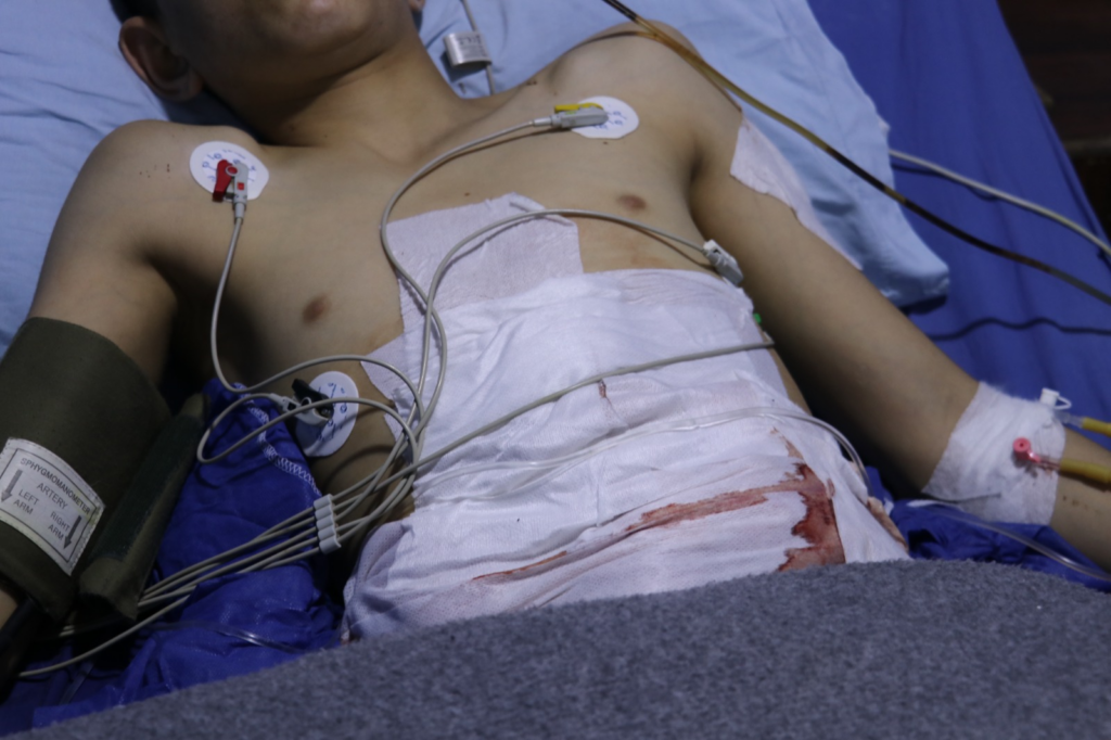 Abdul Rahman al-Khader/al-Hayek/Mawas, a 16-year-old boy, received varying injuries and was subsequently taken to the Afrin hospital in the Fanfin District. Various pictures show his bandaged belly and his body connected to multiple medical devices.