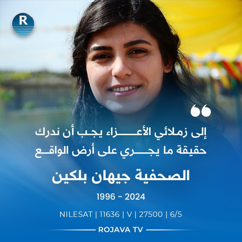 Hawar News correspondent, a young woman, Cihan Muhammed Nesin Belkin, and fellow journalist, Nazim Dashtan, died in a drone strike that took place near Qarqozak Bridge. Their driver, Aziz Hajj Bouzan, was seriously injured.
