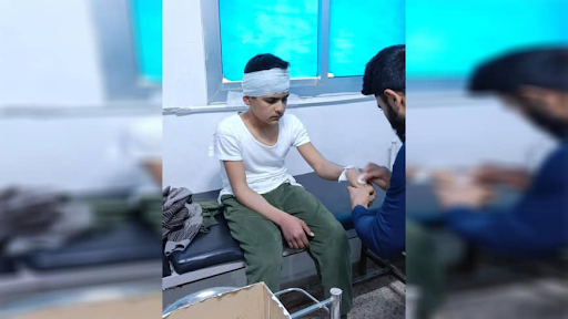 ANF quoted hospital records, reporting that the children were transported to Ain Issa hospital, where medical staff stabilized their conditions following treatment. Ain Issa Plus shared a picture related to the event. The image showed a young boy receiving medical treatment in what appeared to be a basic hospital or clinic setting. The boy, likely a teenager, was seated on a black examination bench against a wall with turquoise-blue window panels. He had a bandage wrapped around his head, indicating a head injury, and was wearing a white T-shirt and green pants. His expression was somber and painful. A man, likely a medical worker, was tending to the boy’s injured wrist or hand, carefully applying gauze or a bandage.