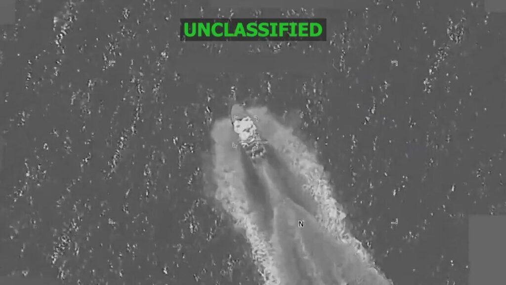 This strike was announced as one of three strikes on vessels in a statement published by @Southcom on Twitter/X on December 15th announcing the strikes on three vessels that were allegedly “transiting along known narco-trafficking routes in the Eastern Pacific and were engaged in narco-trafficking”. The two other strikes on December 15th have been assessed separately in USMAR251215a and USMAR251215b. In a black and white video included in the post, a boat can be seen moving through the water until it erupts into what appear to be flames and smoke and briefly pans out to show the boat stationary and in flames. A second video shows a boat floating in the water until it explodes and a later angle shows two items floating in the water, and then a third video shows a boat moving through the water until an explosion causes flames and smoke. It is unclear which depicted boat resulted in which casualties.