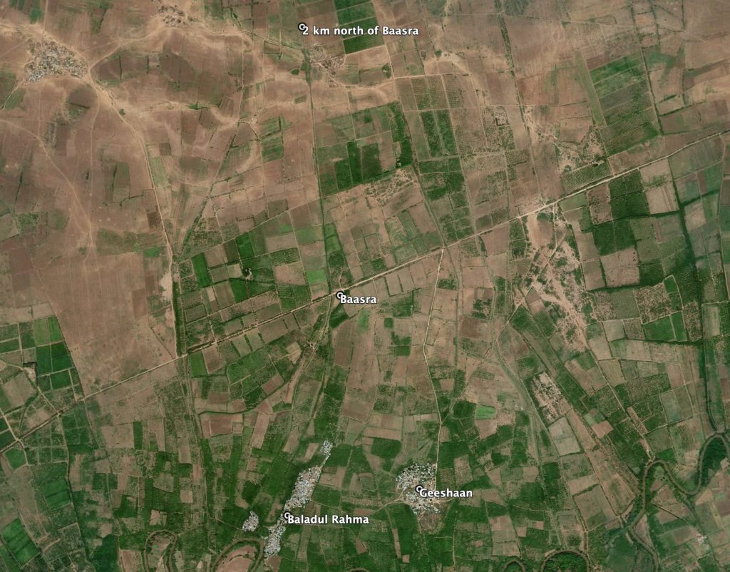 Reports of the incident mention that the strike took place 2 kilometers north of the village Baasra. The coordinates for this area are: 2.329050, 45.265357. Amnesty reported that the US ‘conducted at least three airstrikes in and around Baladul Rahma and Geeshaan’ on this date. These two villages are within very near vicinity of Baasra: the coordinates for Baladul Rahma are: 2.296128, 45.264368; the coordinates for Geeshaan are: 2.297905, 45.273261.