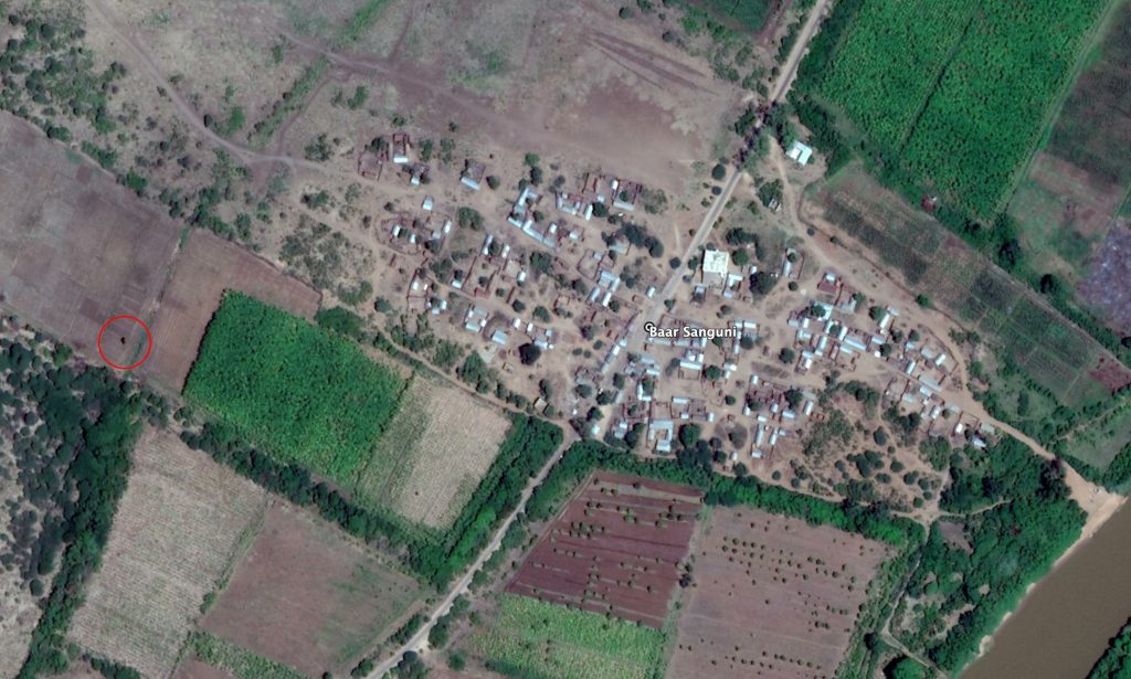 Reports of the incident mention that the strike took place in the area 50 kilometers north of the city Kismayo, for which the generic coordinates are: 0.094994, 42.55361. Reuters reported that on the same day Al Shabaab attacked a Somali base near the village of Baar Sanguni/Sunguuni, north of Kismayo. It is likely that this is the location of this incident. The coordinates for the village Baar Sanguni/Sunguuni are: 0.005132, 42.658247. Photos published by Al Shabaab of the camp show it is located in the vicinity of a radio tower. On satellite imagery of January 2016 a structure just outside of Baar Sanguni that looks like a radio tower can be found at these coordinates: 0.004963, 42.654795. However, the imagery is not conclusive and due to limited information and satellite imagery available to Airwars, we were unable to verify the precise location of the camp and strike.