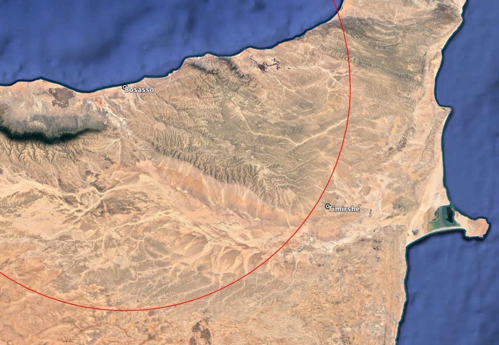 The village of Timirshe, located around 150 kilometers southeast of Bosasso (150 km radius marked in red)