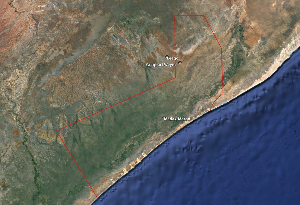 The villages Leego, Yaaqbari Weyne and Madax Marodi, with the Lower Shabelle region marked in red