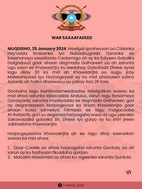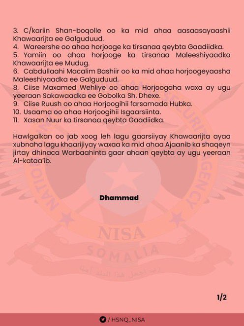 M.M. Dhoore, a former BBC journalist and current managing editor of SNTV London stated that the number of militants killed in the strike was higher, quoting Somalia’s National Intelligence and Security Agency (NISA) which claimed that 30 militants had been killed, including 11 “top commanders”. The released list of the 11 commanders killed included Abdi Jarin Shan-Bogolle and Abdullahi Maalim Bashir. Haberler.com reported that Abdi Jarin Shan-Bogolle was known as one of the ‘Khawrij’ founders in the Galgaduud region. ‘Khawrij’ is the preferred term recently used by the Somali government to refer to the Al-Shabaab militant group.
