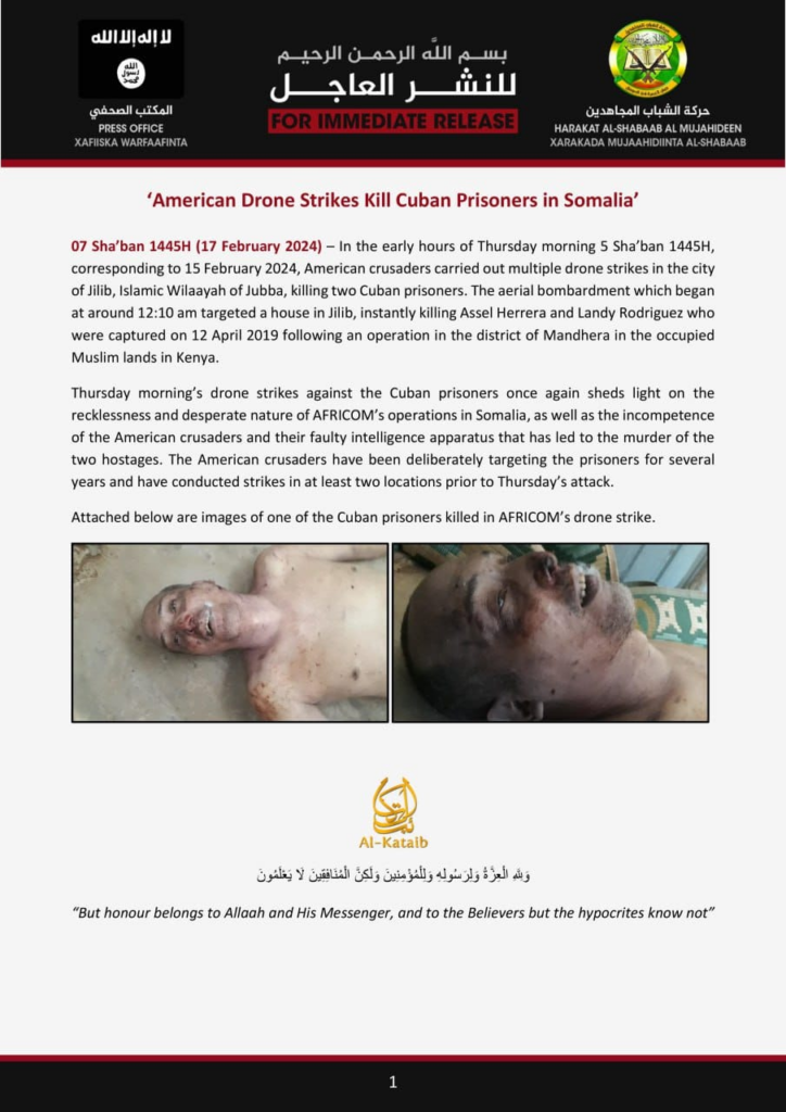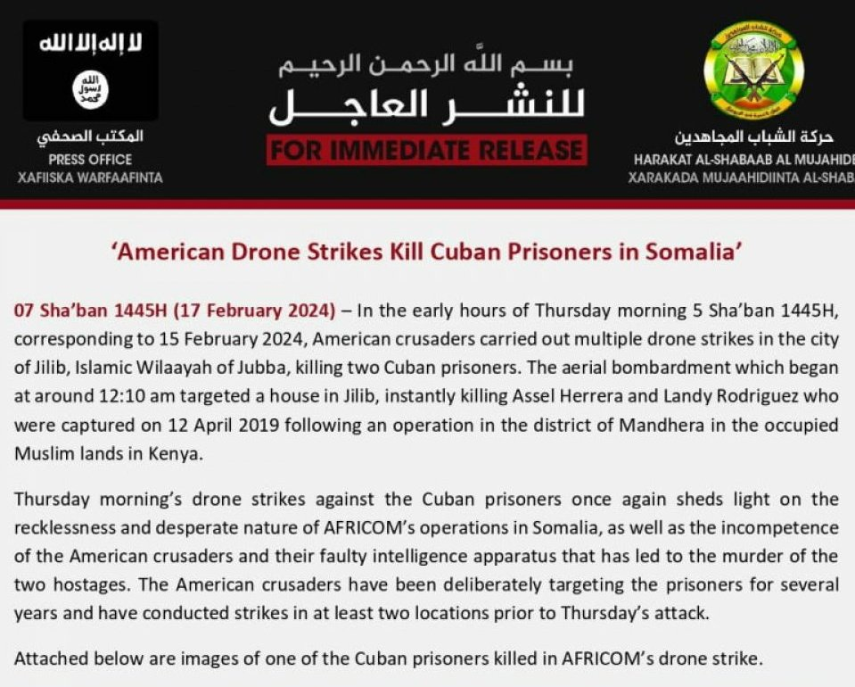 Two Cuban doctors, general medicine specialist Assel Herrera and surgeon Landy Rodriguez, were reportedly killed in a declared U.S. airstrike (possibly drone strike) conducted around 12:05am on the 15th of February 2024 in the town of Jilib, in the region of Middle Juba, Somalia. The militant group Al-Shabaab stated via Telegram that it had captured the two doctors on the 12th of April, 2019 in Kenya and further claimed that they were killed in an airstrike conducted by AFRICOM (United States Africa Command) which had struck a house in Jilib. The statement from Al-Shabaab also contained two photos which claimed to show the dead body of one of the two doctors.
