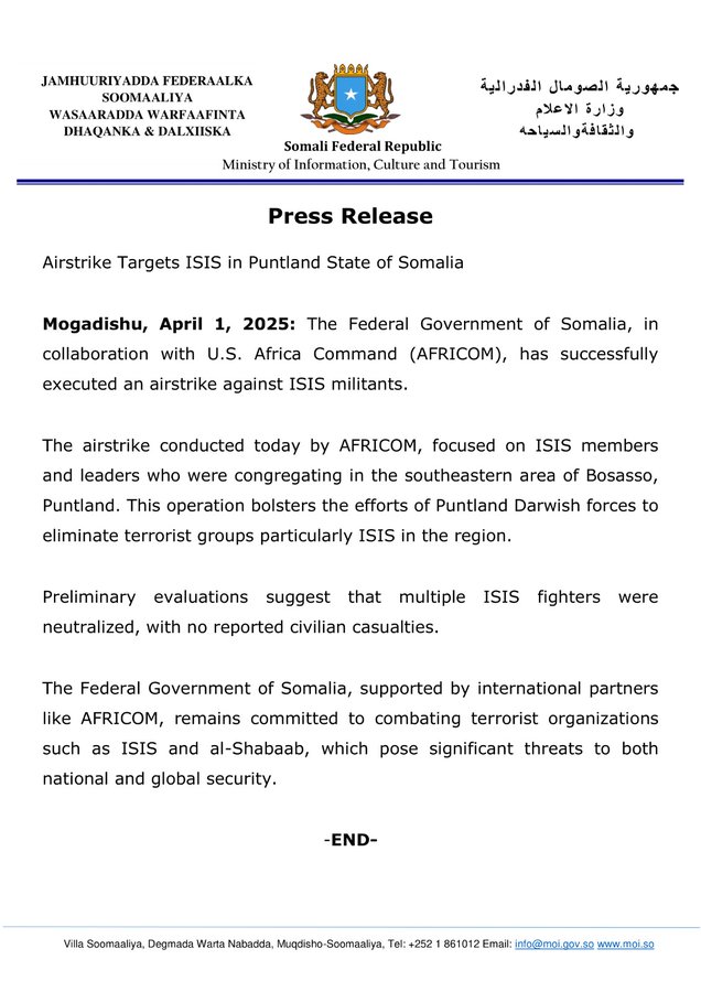 On Tuesday, 1 April 2025, five alleged ISIS-Somalia (Daesh) militants were killed in the Al-Miskaad mountains southeast of Bosasso in Puntland State, Somalia, in an airstrike declared by US Africa Command (AFRICOM) forces in collaboration with the Federal Government of Somalia. No civilians were officially reported as injured or killed in the strikes.