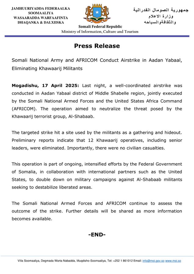 At night on Wednesday, 16 April 2025, 12 alleged Al-Shabaab militants were killed in the vicinity of Adan Yabaal district, Middle Shabelle, Somalia, in an airstrike declared by US Africa Command (AFRICOM) forces in collaboration with the Federal Government of Somalia. No civilians were officially reported as injured or killed in the strikes.