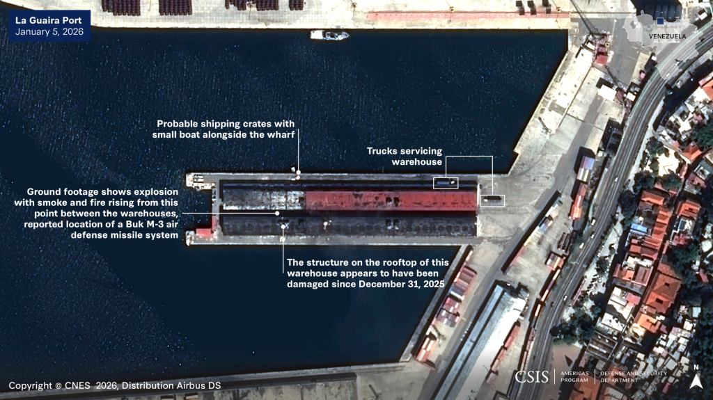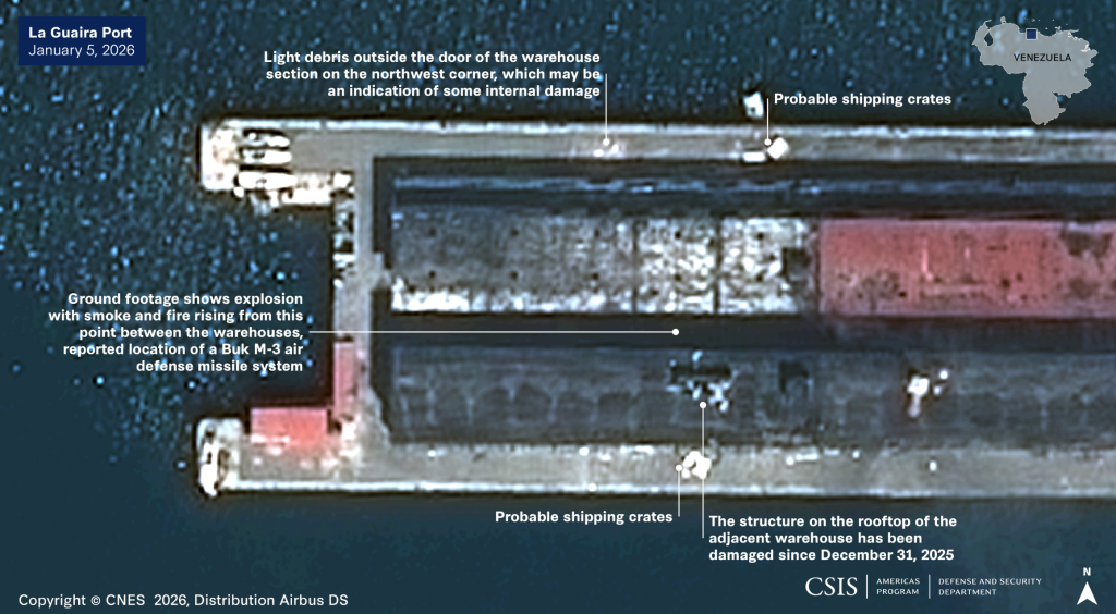 An alleged U.S. military attack destroyed a warehouse with medical supplies in Puerto La Guaira, Venezuela on January 3, 2026.