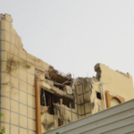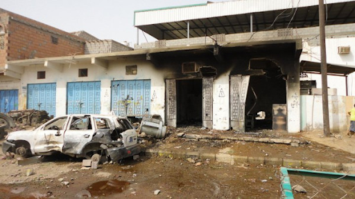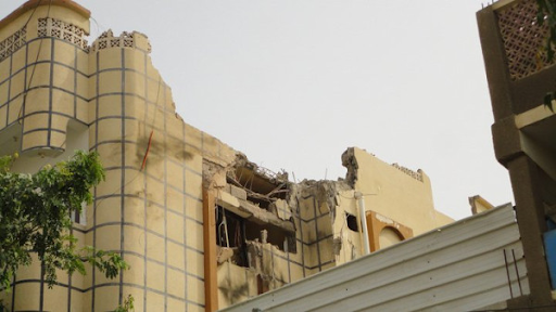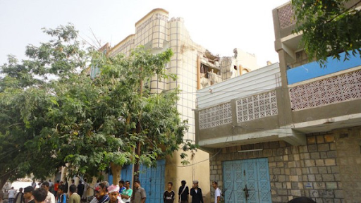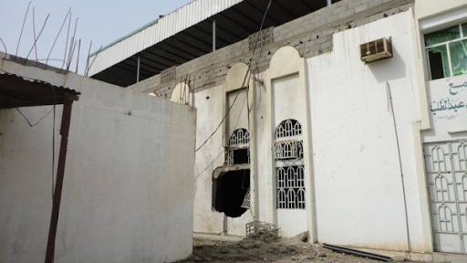A tweet from @AdenLang identified that the right side of the mosque was damaged from the bombing and @YusraAlA added that Nasser Abdulrab al-Yafi’s building was partially destroyed by the bombardment.