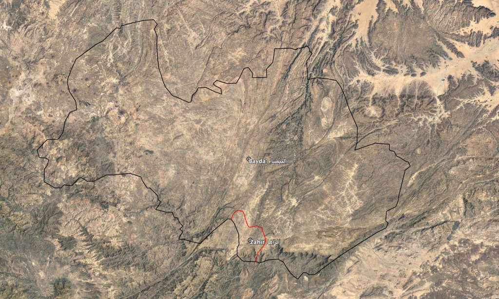 Reports of the incident mention that a moving vehicle was targeted in the Az Zahir (الزاهر) district of the governorate Al Bayda (ٱلْبَيْضَاء‎). The generic coordinates for the Az Zahir (الزاهر) district are: 13.95865, 45.419055. Due to limited information and satellite imagery available to Airwars, we were unable to verify the location further.