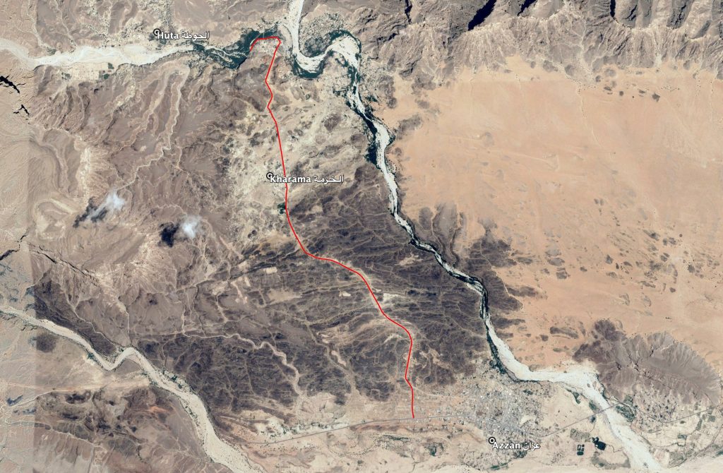 The village Kharama (or Karma) (الـخـرمـة) between the towns of Azzan (عزان) and Huta (الحوطة), with the road between the two towns marked in red