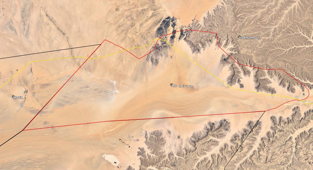The Al Abr (حصن العبر) district of Hadhramout (حضرموت) governorate with marked in yellow the main road connecting Ma’rib and Hadhramout governorates