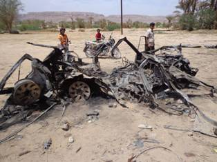 According to evidence submitted by human rights groups to a Senate subcommittee hearing, the missiles landed within 15 metres of occupied houses and pedestrian paths. At least two passers-by, unnamed civilians, were killed by flying shrapnel. The submission said Salem Ahmed, 50, was a preacher at the local mosque, a teacher, and studying for a doctorate at the University of Hadramout. His father, Ahmad bin Salim Salih bin Ali Jabir, 77, investigated the strike and found people gathered at the site “wrapping up body parts of people from the ground, from here and there, putting them in grave clothes like lamb”. Salem Ahmed’s mother had fainted when the strike hit and she died a few weeks later. Walid Abdullah, 26, was a traffic policeman with a two and a half year old son. His brother said the boy was initially called Saud, but the family renamed him after his father. Whenever the child hears the sound of an airplane “he screams and yells, ‘The plane, the plane, the plane, my father, my father, I want my father’”.