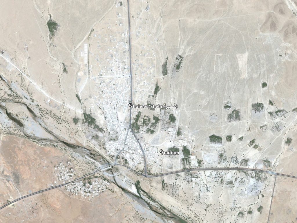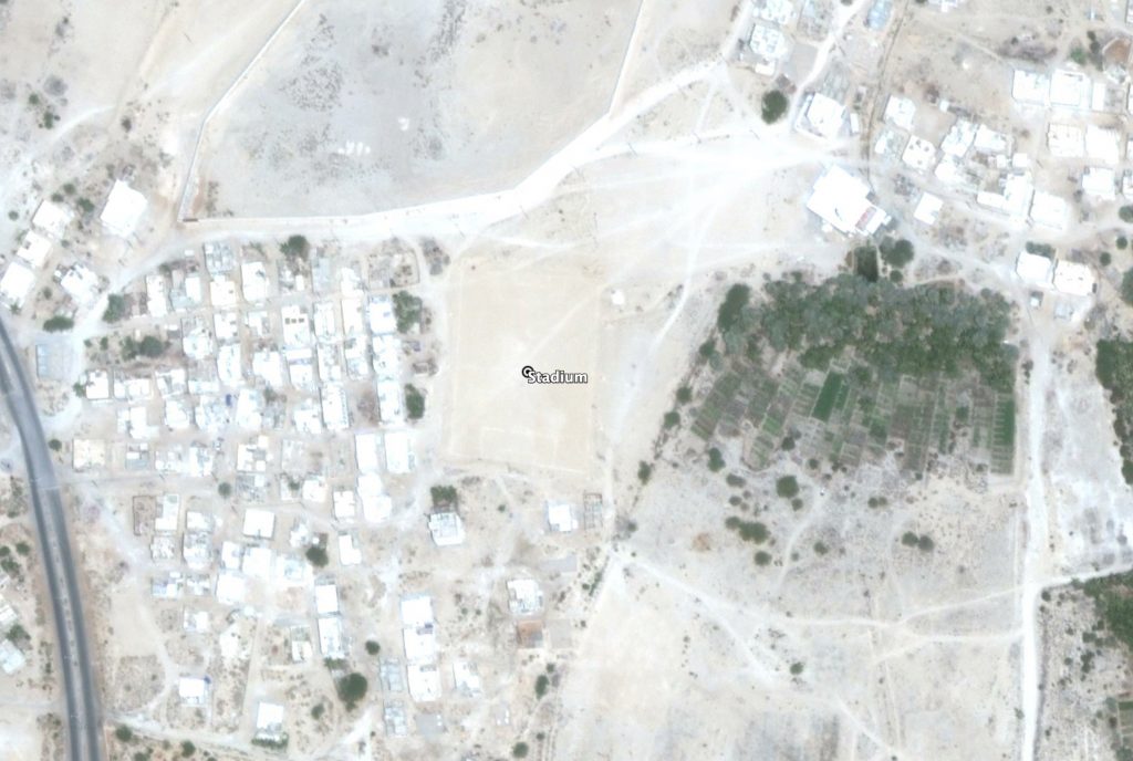 The Wahid Shoheer Club stadium (ملعب نادي وحدة شحير) on the first available satellite image after the strike (15 February 2013)