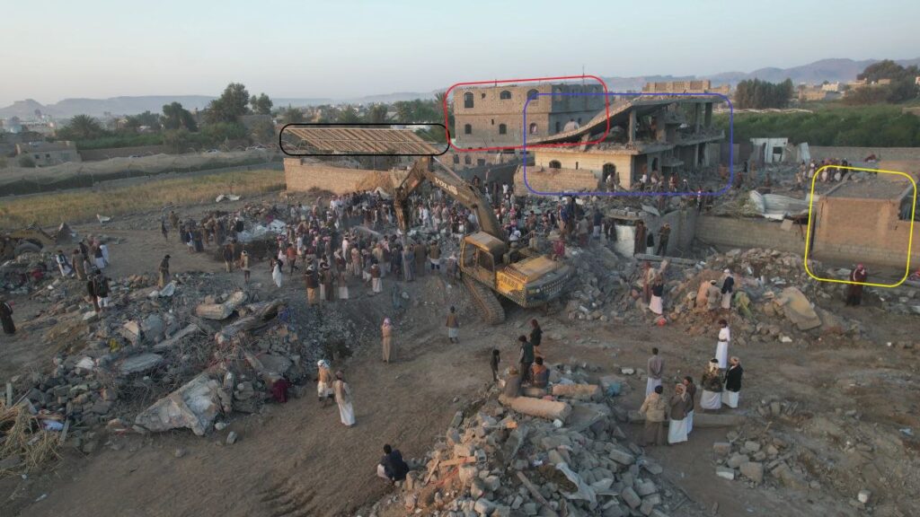 A Facebook post from Majed Al Madani Sanaa on March 15th provided the “latest statistics” on the strike in Qahza – 10 killed, most of them women and children, and 13 wounded. Majed Al Madani Saada later stated on March 16th that the strikes had “claimed the lives of a family of 28 people, most of whom were women and children”. Accompanying images show a construction excavator digging through the rubble of a building with dozens of onlookers. Mwatana reported that the strikes occurred at around 2:06am on March 16th, when three airstrikes hit a civilian home and killed 14 civilians, 10 children and four women, injured four others, including three children, and damaged two neighboring houses.