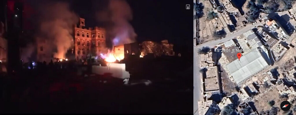 Reports of the incident mention a strike on Al-Thawra neighbourhood (مدينة الثورة) in Sanaa (صنعاء). This incident was independently geolocated by Ben Tzion Macales (@BenTzionMacales). Satellite imagery shows the strike location at the following exact coordinates: 15.400507, 44.208518.