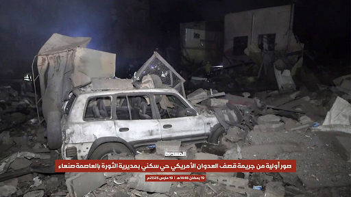 An video shared by NBC on March 20 showed on-the-ground video imagery from the the morning after the strike. The video includes clips of residential buildings, a large and smoldering structure (perhaps the manufacturing facility referred to by other sources), a white car (also included in video shared by other sources, including Al-Masirah), and what may be an impact crater. Citing the “Houthi-run health ministry”, a video caption says that nine people were injured after “strikes left a densely populated neighborhood in the Al-Jarraf district in ruins”.