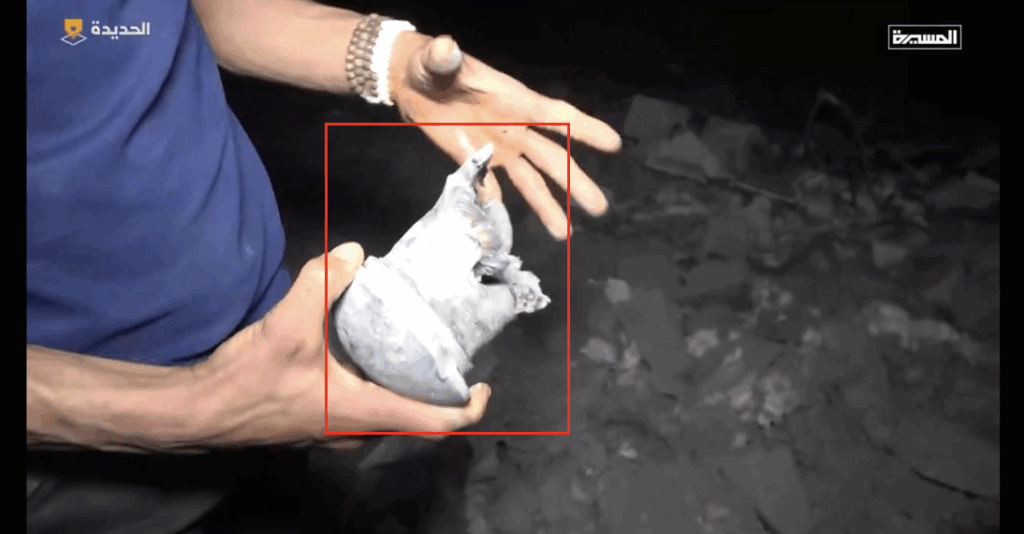 An image of a munition found at the location of this incident published by Al Masirah TV on Twitter/X has been identified as an MK-80 series bomb, which is an air-delivered munition, by munitions experts at the Open Source Munitions Portal, a joint project between Airwars and Armament Research Services.