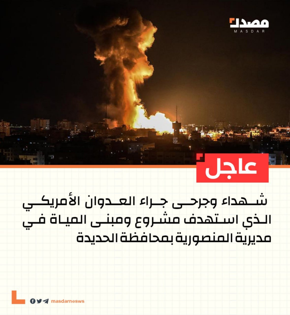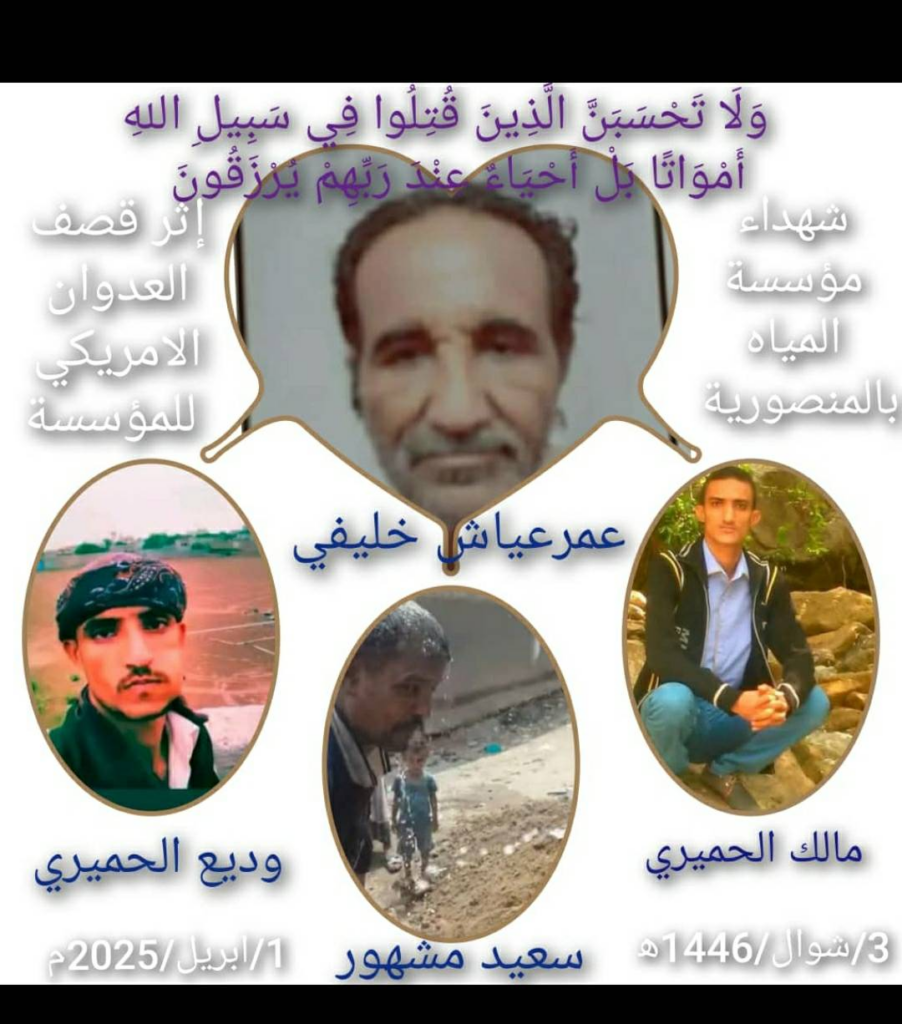 Initial reports from @TvAlmasirah stated that “martyrs and wounded” had resulted from the US “targeting” of the Water Authority building in Al-Mansouriyah. A post from Faris Abu Firas Al-Tabi’i reported that four people were killed by American attacks on the Water Authority building, and provided their names: Wadih Ahmed Saeed Al-Humairi, Malek Ahmed Saeed Al-Humairi, Omar Ayash Khalifi, and Saeed Mashhour. A memorial message from Raouf Al-Mazjaji also mentioned that Ali Abdullah Jabali had been injured, and wished him a speedy recovery.