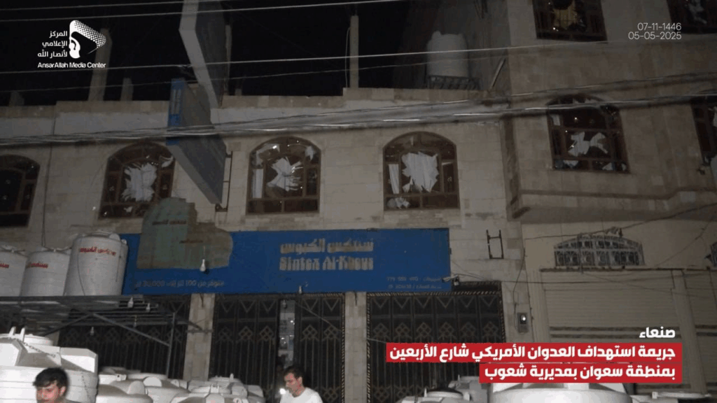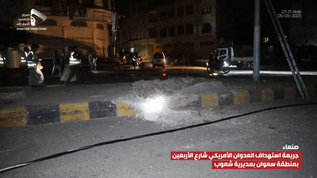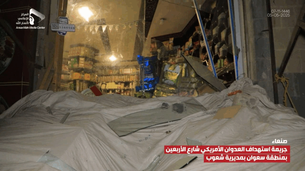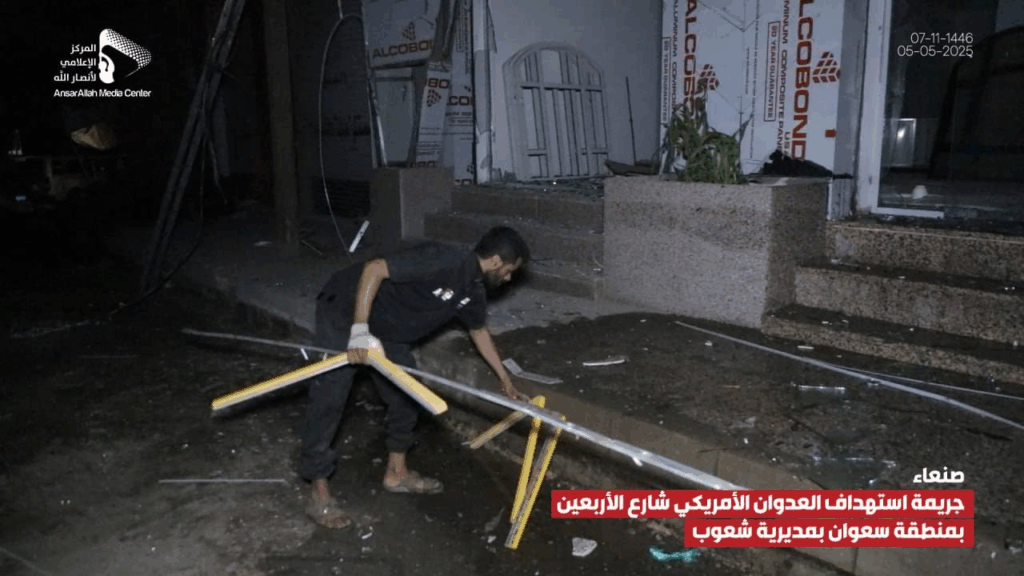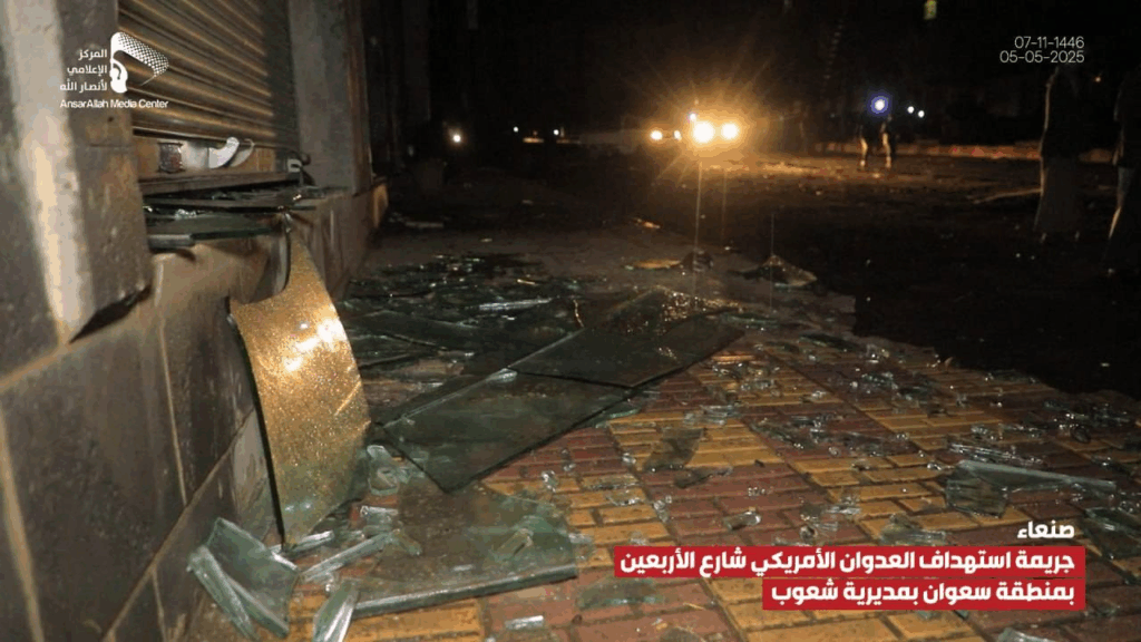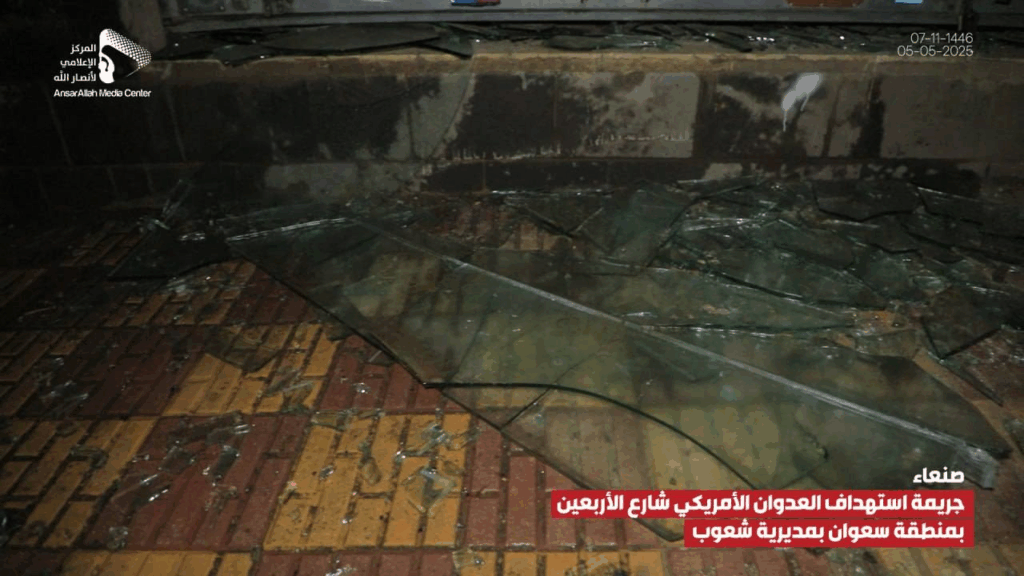 At least 14 people were reported injured by an alleged bombardment on Al-Arbaeen Street in the Sha’oub District of Yemen’s capital, Sana’a on 5 May, 2025. While most sources alleged US involvement, one source claimed the damage was due to a failed Houthi missile launched in an attempt to “intercept a US reconnaissance plane”.