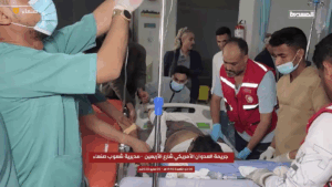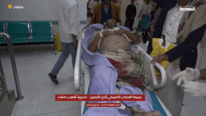Photographs shared by Facebook user Abo Kalel confirmed the extensive damage: shattered glass strewn across a street, swathes of blood on a hospital floor, and a deep crater where the missile presumably landed. Included in the series of photographs are pictures of injured men, including one man with lower facial and neck bandages, another man lying on a hospital bed with bloodied shorts and bandages on his head, arm, and leg, another man, face contorted in pain, as he received medical care, and a young man or teenager, attached to an IV. Similar scenes were shown in a video shared by Facebook user “Where is the explosion now?”