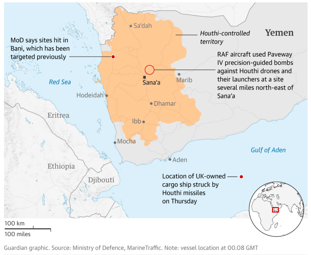 The UK Ministry of Defence announced: “Four Royal Air Force Typhoon FGR4s, supported by two Voyager tankers, again participated in a deliberate coalition strike on Saturday 24 February against Houthi military facilities in Yemen which had been conducting missile and drone attacks on commercial shipping and coalition naval forces in the Bab al Mandab, southern Red Sea, and Gulf of Aden. The RAF aircraft were allocated multiple targets located at two sites. Intelligence analysis had successfully identified several very long-range drones, used by the Houthis for both reconnaissance and attack missions, at a former surface-to-air missile battery site several miles north-east of Sanaa. Our aircraft used Paveway IV precision guided bombs against the drones and their launchers, notwithstanding the Houthis’ use of the old missile battery revetments to try to protect the drones.”