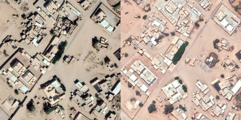 Satellite imagery from May 2019 (right) shows evidence of structural damage. The photo on the left is from December 2018.
