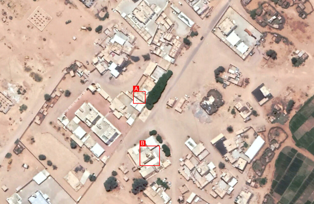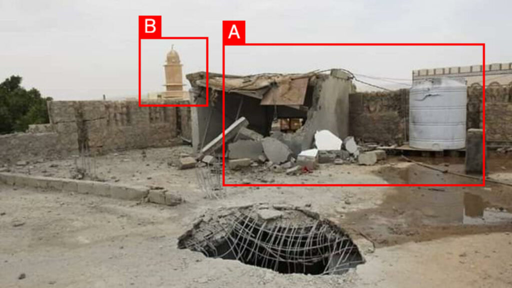 Reports of the incident mention a reception hall being struck in Wadi Obeida (وادي عبيدة), in vicinity of what some sources claim as the “Kara” area, east of Ma’rib (مأرب) city. Combining visual material from sources we have been able to identify the exact location of the strike.