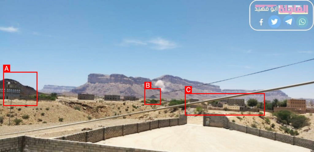 Reports of the incident mention the Wadi or Jabal Amaqin (عماقين), within the Al Rawda (الروضة) district of Shabwa (شبوة) governorate. Research shows the location to be locally known as Jabal Al Hawl (جبل الحاول), located west of both Al Rawda city and Amaqin town. Comparing various audiovisual materials of the location, we have narrowed this strike down to an approximate location.