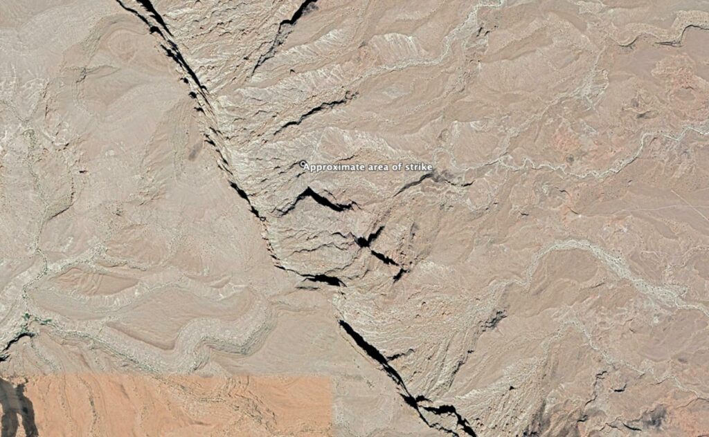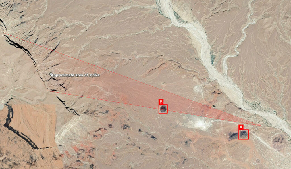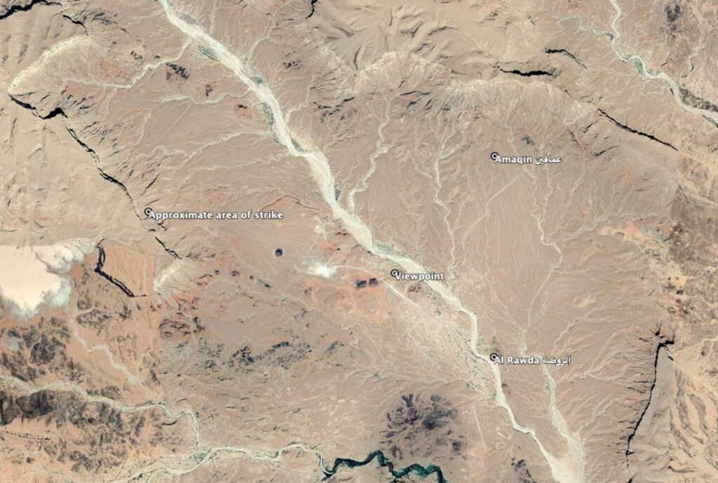 Satellite imagery of the viewpoint with tags and sight markers, indicating the approximate location of the strike.