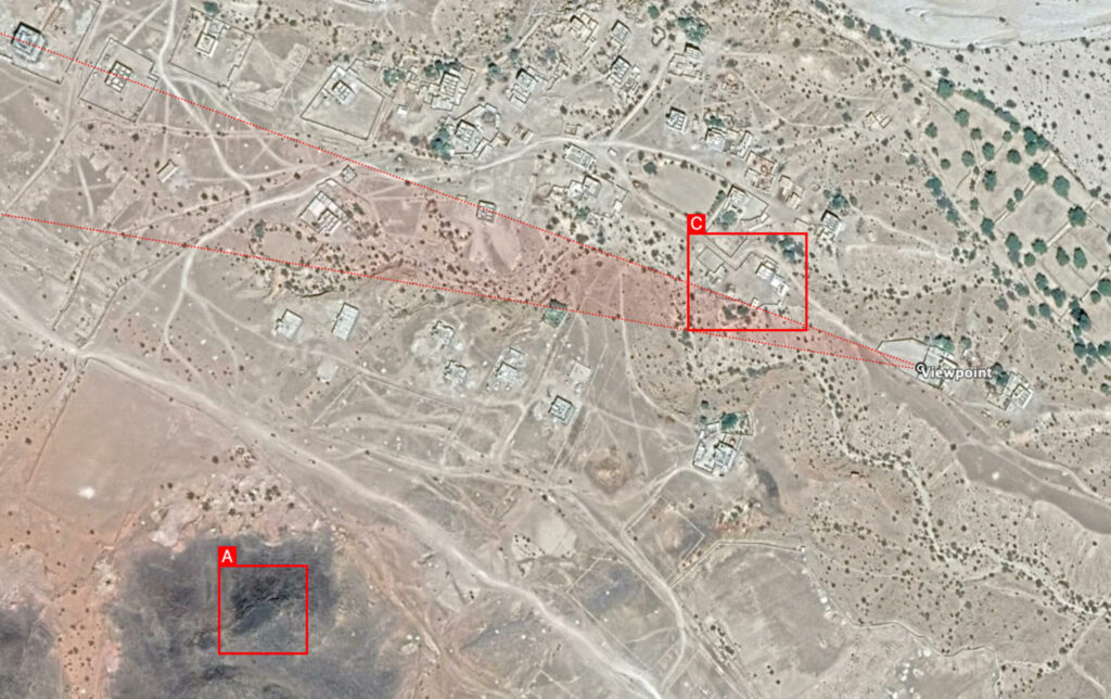 Reports of the incident mention the Wadi or Jabal Amaqin (عماقين), within the Al Rawda (الروضة) district of Shabwa (شبوة) governorate. Research shows the location to be locally known as Jabal Al Hawl (جبل الحاول), located west of both Al Rawda city and Amaqin town. Comparing various audiovisual materials of the location, we have narrowed this strike down to an approximate location at the coordinates: 14.502728, 47.195511.