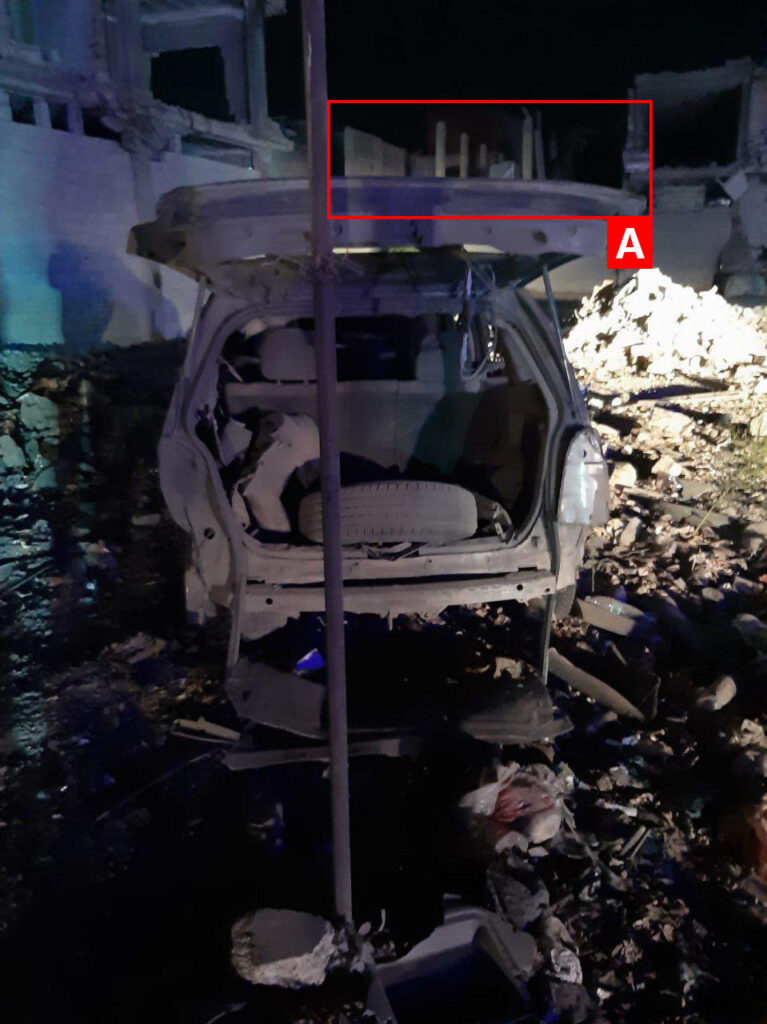 Reports of the incident mention a strike on the Al Sina’a (الصناعة) industrial neighbourhood of the city of Afrin (عفرين). Analyzing audio-visual material from sources, we have narrowed down the location to these exact coordinates: 36.509561, 36.873402.