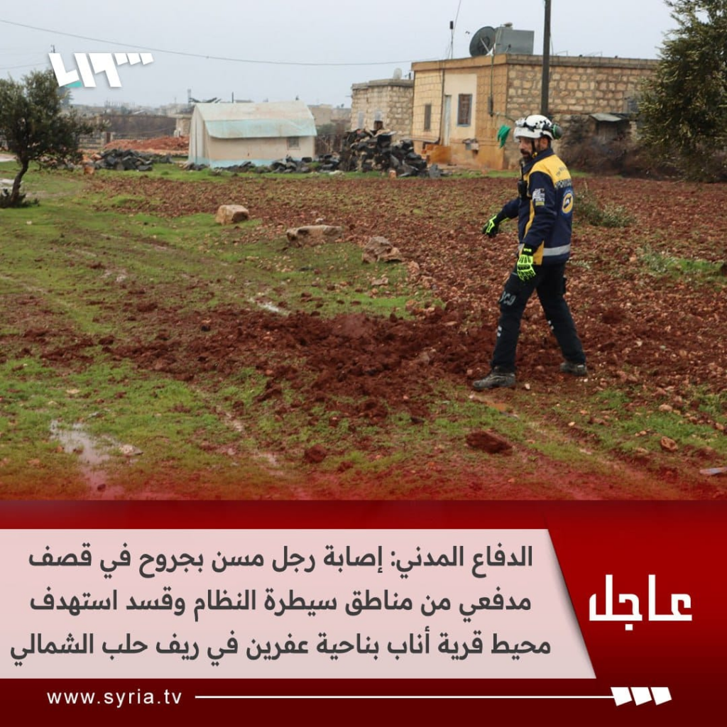 During the morning of Tuesday, 30th January 2024, an elderly man was injured in an artillery bombardment with contested responsibility allegedly perpetrated by the Syrian Democratic Forces and/or the Syrian regime forces on a residential home and surrounding agricultural lands in the village of Anab located in the northern countryside of Afrin, north of Aleppo, Syria.